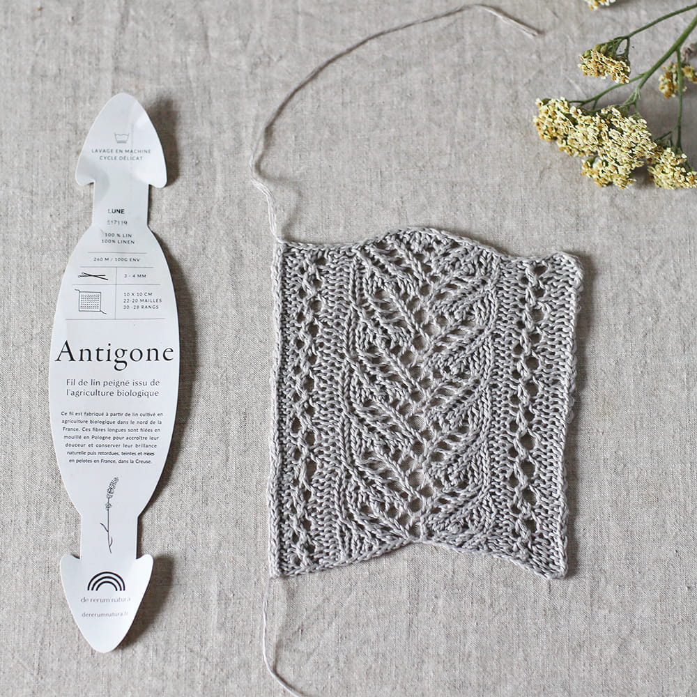 Antigone od francuskiego producenta De Rerum Natura to piękna lniana włóczka. Złożona z dziesięciu pasm dobrze skręconego lnu jest gładka i jedwabista. Można ją przerabiać na cienkich drutach, aby uzyskać zwartą dzianinę o regularnym kształcie lub wybrać większy rozmiar drutów i wykorzystać jej naturalny układ do stworzenia luźnych ażurowych wzorów.